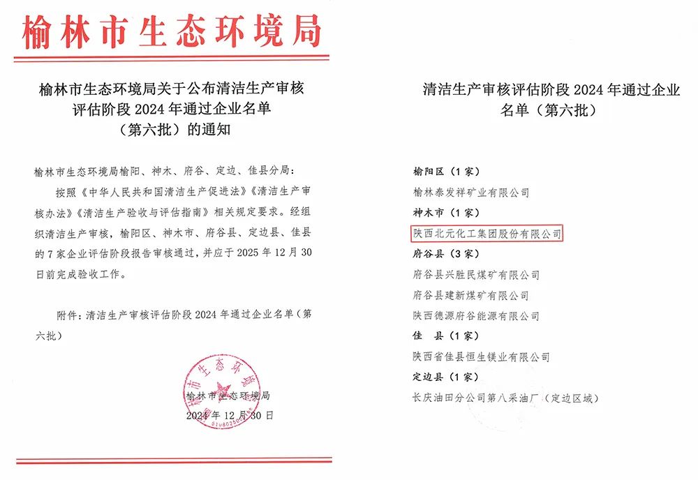 近日,榆林市生态环境局公布关于清洁生产审核评估阶段2024年通过企业名单(第六批),北元集团榜上有名,标志着公司在清洁生产、绿色发展方面取得了重要成果。