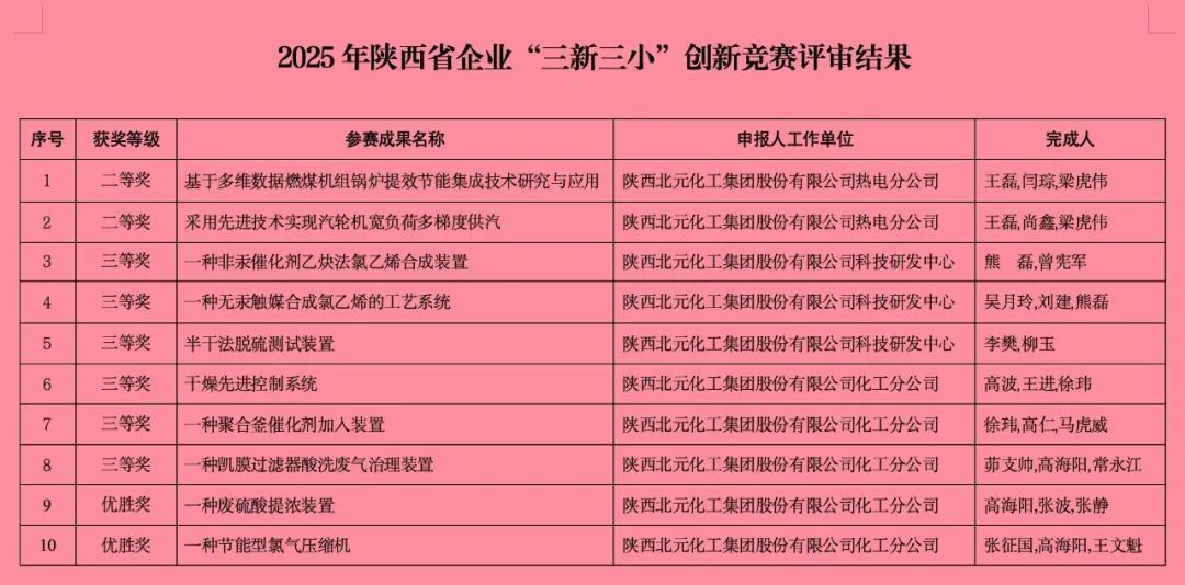 近日,陕西省科学技术协会发布《2025年陕西省企业“三新三小”创新竞赛结果公示》,北元集团10项成果获奖。