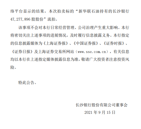 9月16日消息,长沙银行发布关于股东所持股份被司法拍卖的进展公告。公告显示,第二次公开拍卖的新华联石油持有的长沙银行4727.79万股股份遭遇流拍。