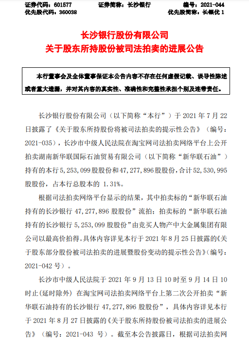 此前8月,长沙市中级人民法院在淘宝网司法拍卖网络平台上公开拍卖新华联石油持有的长沙银行525.31万股股份和4727.79万股股份,合计约占长沙银行总股本的1.31%。其中,4727.79万股股份流拍,525.31万股股份被物产中大金属集团有限公司以4152.28万元的成交价拍得。
