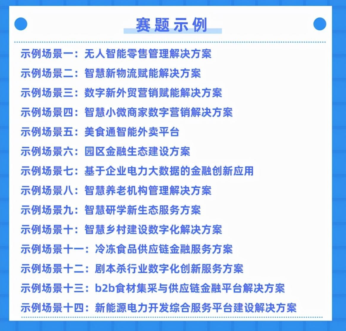 围绕大赛主题、两大方向、五大赛道,大赛提供14个场景示例,供选手参考理解,可直接作为意向选题进行填报: