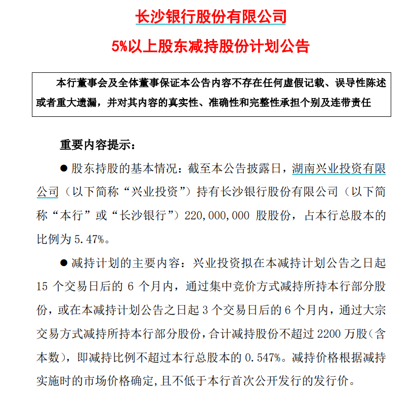 值得注意的是,此前长沙银行发布了限售股解禁公告,其中,兴业投资持有的2200万股股份在9月27日刚被解禁,其仍剩余19800万股限售股。