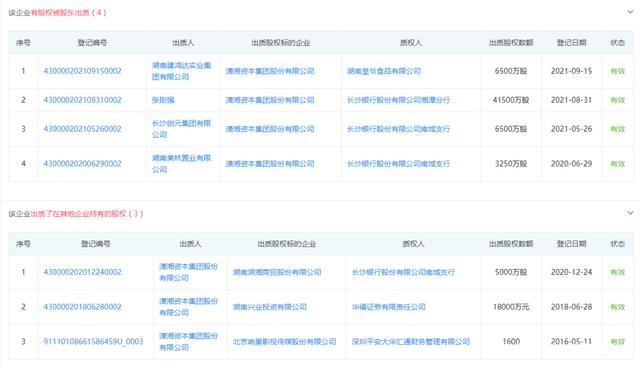 另外,2020年至今,潇湘资本的股东湖南建鸿达实业集团有限公司、张刚强、长沙创元集团有限公司、湖南美林置业有限公司四家公司出质了所持潇湘资本的股份,出质股权数额分别为6500万股、41500万股、6500万股、3250万股,处于有效状态。