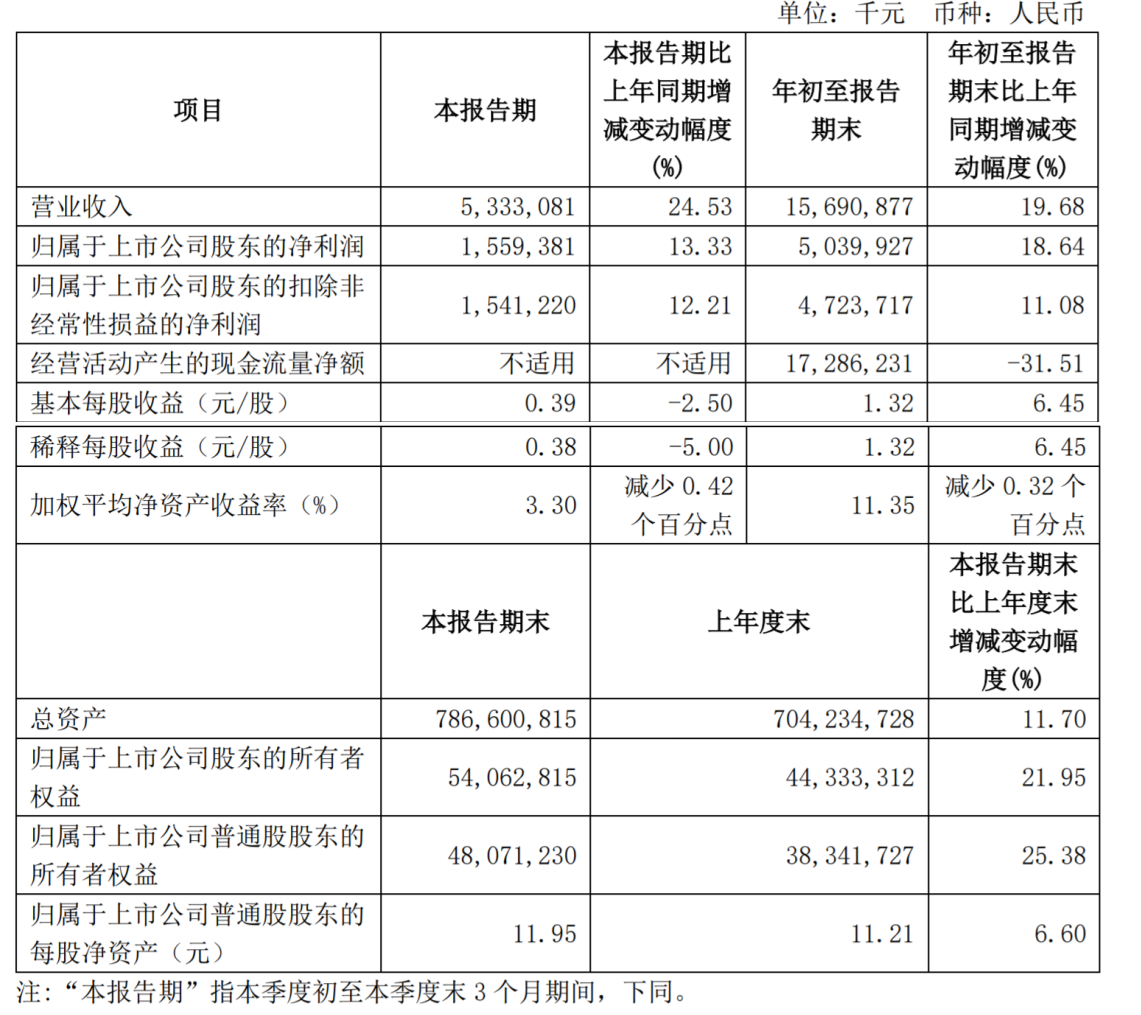 公告显示,长沙银行第三季度营业收入为53.33亿元,比上年同期增长24.53%;归属于上市公司股东的净利润为15.59亿元,比上年同期增长13.33%。
