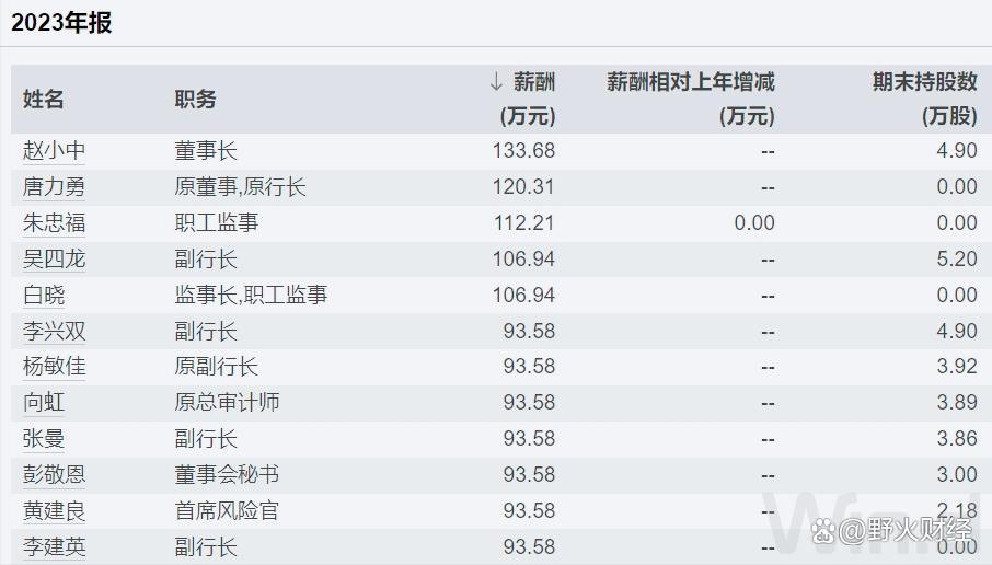 根据2023年报披露,赵小中薪酬大约为134万元,为最高,原行长唐力勇等四位高层薪酬也超过百万元,其他高层薪酬大多则系统,都是93.58万元;2024年报中表示,高管薪酬还在统计中,暂时没有披露。