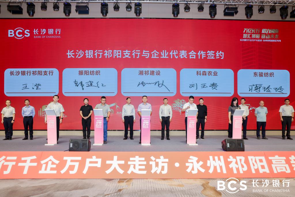 5 月 27 日下午,万亿长行给力湖南智汇祁阳链动未来——长沙银行千企万户大走访·永州祁阳高新区专场活动在祁阳举行。现场,长沙银行发布了祁阳高新区产业链服务专案,为园区、企业送上了公司、零贷、零售等多领域的"金融服务大礼包",并进行了合作签约。