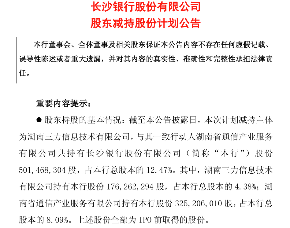 截至公告披露日,本次计划减持主体三力信息与其一致行动人湖南省通信产业服务有限公司共持有长沙银行股份5亿股,占该行总股本的12.5%。其中,三力信息持有1.8亿股,占比4.4%;湖南省通信产业服务有限公司持有3.3亿股,占比8.1%,上述股份全部为IPO前取得。