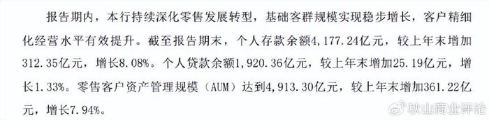 个人存款余额则是达到了4177.24亿元,较上年末增加312.35亿元,增长8.08%。个人贷款余额为1920.36亿元,较上年末增加25.19亿元,增长1.33%。其中,个人消费贷款余额808.45亿元,较上年末增加56.66亿元,增长7.54%。