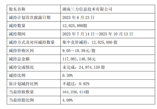 截至2025年10月13日,本次减持计划期限届满,三力信息通过集中竞价方式累计减持该行股份1202.58万股,减持比例0.3%。