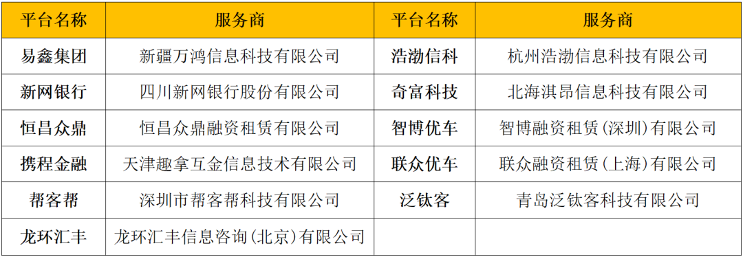 其中,平台类第三方服务商包括:易鑫集团、新网银行等11家机构,具体名单如下: