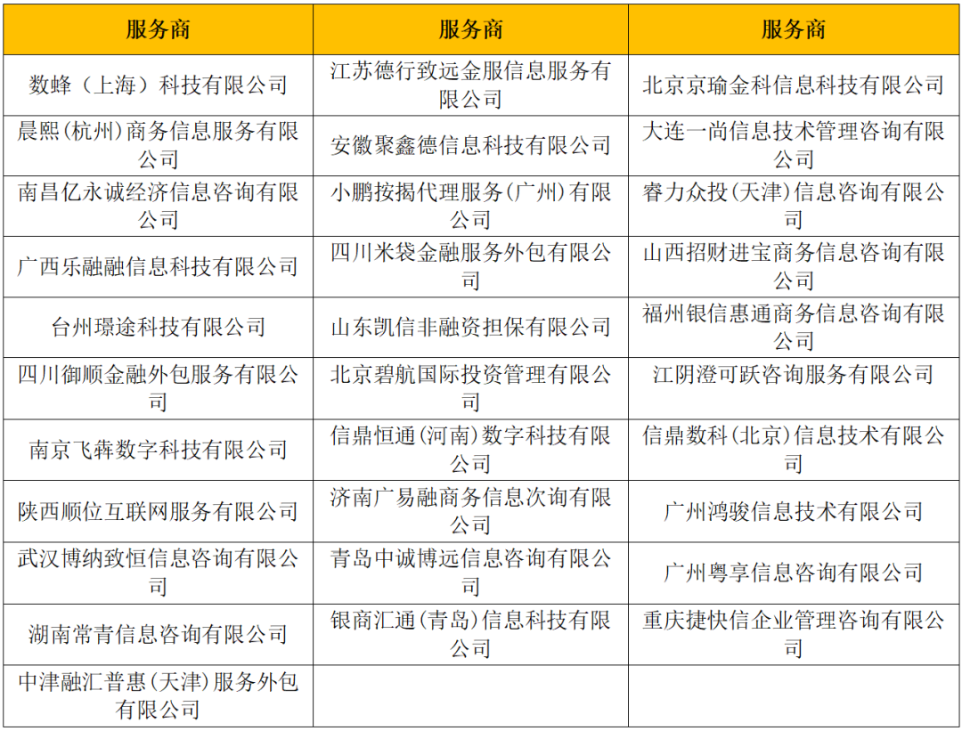 其他第三方服务商包括:中津融汇普惠(天津)服务外包有限公司、四川米袋金融服务外包有限公司等31机构,具体名单如下: