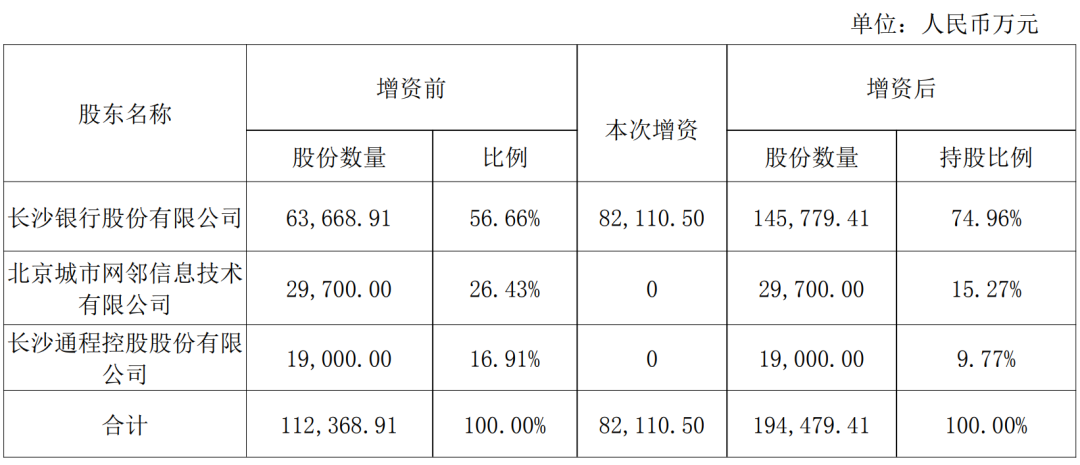 长沙银行表示,本次增资能进一步充实长银五八消金的资本,增强其风险抵御能力,为其持续稳健经营创造条件。若本次增资获批,长沙银行对长银五八消金的持股比例将从56.66%增至74.96%,而另外两家股东——城市网邻(58同城)、通程控股(000419.SZ)的持股比例则将从26.43%、16.91%分别稀释至15.27%、9.77%。