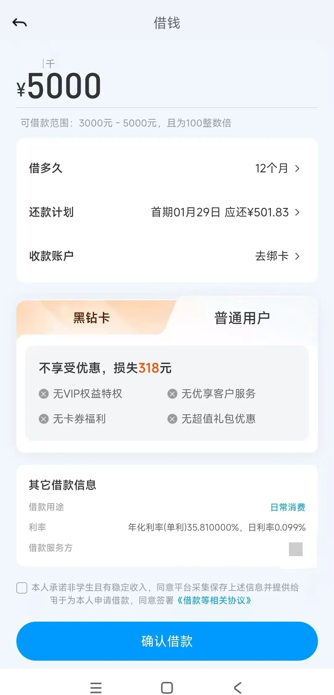 助贷合作机构包括:柚借(重庆两江新区通融小额贷款有限公司),产品年化利率7.2%-24%。XX贷(XX云科信息技术有限公司)。例如,小编尝试在XX贷借款5000元,分12期,默认推荐购买“黑钻卡”(专享息费94折,最高省318元,仅需300元),年化利率23.95%(每期还款472.68元),但如果选择“普通用户”(不享受优惠,损失318元),页面显示,年化利率35.81%(每期还款501.83元)。