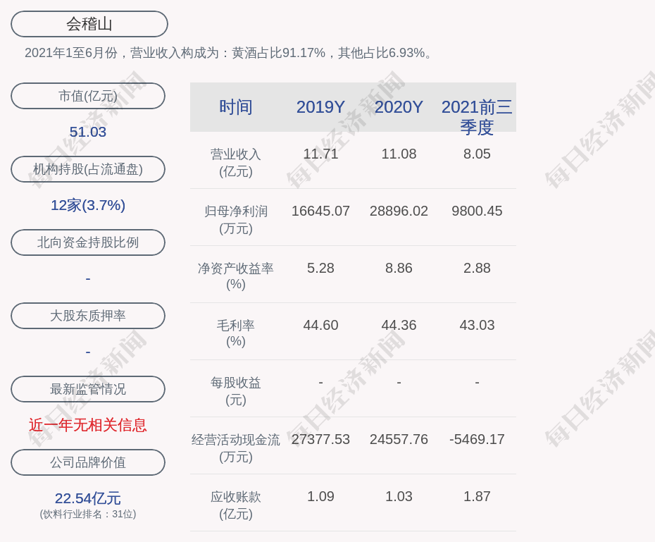 2021年1至6月份,会稽山的营业收入构成为:黄酒占比91.17%,其他占比6.93%。