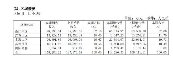 从2024年年报来看,2024年,会稽山浙江大区销售收入为9.83亿元,较2023年增加了约1.3亿元,浙江大区销售收入占该公司总销售收入比例已达62.1%。虽然在浙江大区,会稽山已经遥遥领先古越龙山,但在非浙江地区?会稽山却是落后的。年报数据显示,在非浙江地区,古越龙山2024年销售收入为13.7亿元,高出会稽山同地区销售收入的5.9亿元。