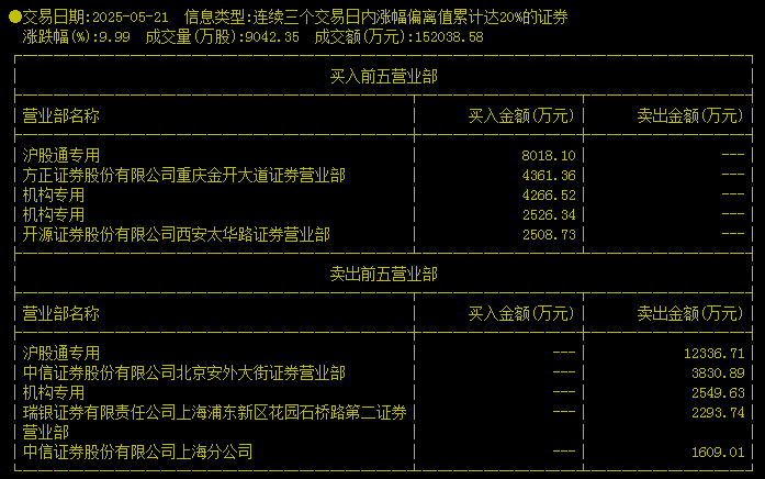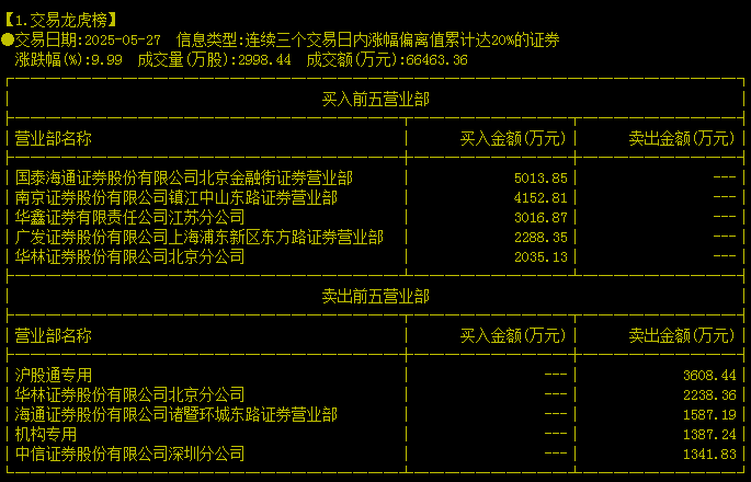 上交所公开交易信息显示,5月26日和27日这两天,国泰海通证券北京金融街营业部和南京证券镇江中山东路营业部分别买入5014万元和4153万元,其中,国泰海通证券北京金融街营业部正是市场活跃游资的聚集地,极其善于捕捉短线机会。