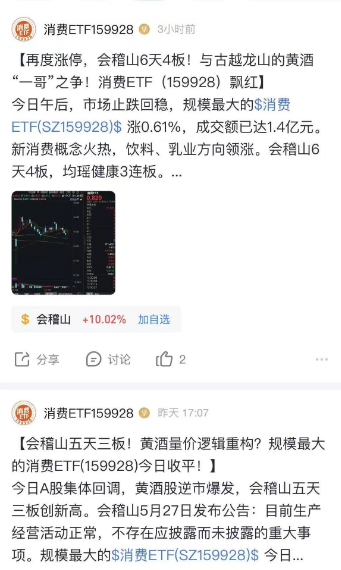 以汇添富为例,其在雪球认证的“消费ETF159928”账号连续发布会稽山涨停相关快讯,借势宣传消费ETF的投资价值。