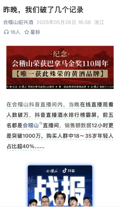 华泰证券分析指出,会稽山在营销策略上,采取与抖音顶流白冰跨界合作的破圈行动,成功吸引了大量年轻消费者的关注和参与。这种聚焦Z世代的策略,不仅重塑了消费者对公司产品的视觉、口感、品牌认知,更推动了黄酒文化在年轻消费群体中的认知转化,为传统黄酒品类注入了年轻化的活力基因。