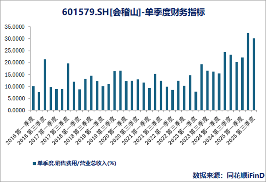 不过,会稽山业绩增长很大程度上得益于激进的营销策略。为推进高端化与年轻化战略,采取了高强度的费用投放策略。2025年前三季度,公司销售费用率同比大幅提升7.2个百分点,达到27.6%的阶段性高点。这一趋势在第三季度更为突出,单季销售费用率飙升至30.21%,较去年同期增加6.84个百分点,销售费用同比增幅更是高达56.5%。