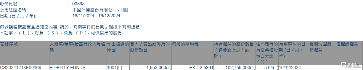 格隆汇12月16日丨根据联交所最新权益披露资料显示,2024年12月10日,中国外运(00598.HK)获FIDELITY FUNDS在场内以每股均价3.5361港元增持195.2万股,涉资约690.25万港元。