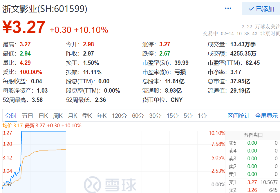 2月14日,截至10:38,浙文影业(SH:601599)涨停,涨10.10%,现报3.27元,成交额4255.35万元,总市值为37.95亿元。