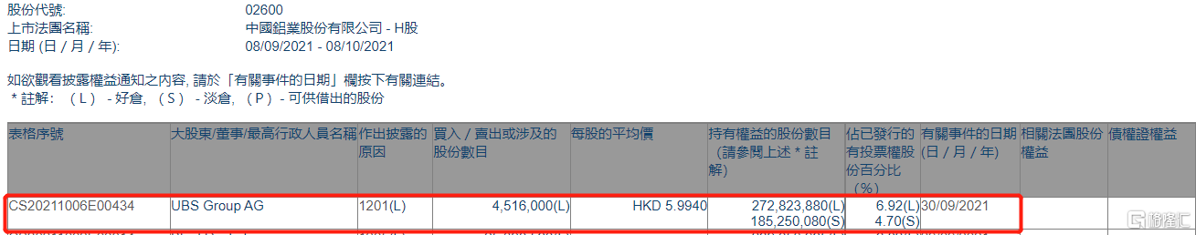 格隆汇APP获悉,根据联交所最新权益披露资料显示,2021年9月30日,中国铝业(02600.HK)遭UBS Group AG在场内以每股均价5.994港元减持好仓451.6万股,涉资约2706.9万港元。