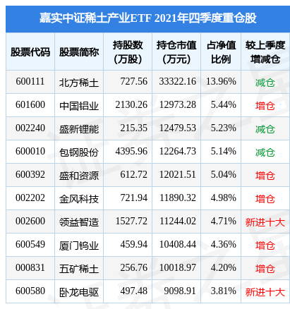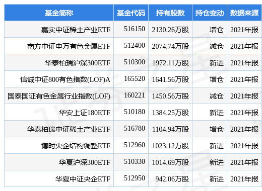 根据2021年报基金重仓股数据,重仓该股的基金共268家,其中持有数量最多的基金为嘉实中证稀土产业ETF。嘉实中证稀土产业ETF目前规模为23.87亿元,最新净值1.2774(3月22日),较上一日下跌0.23%,近一年上涨30.48%。该基金现任基金经理为田光远。田光远在任的公募基金包括:嘉实恒生中国企业ETF(QDII),管理时间为2021年6月4日至今,期间收益率为-31.1%;嘉实中证软件服务ETF,管理时间为2021年6月4日至今,期间收益率为-24.46%;嘉实中证科创创业50ETF,管理时间为2021年6月25日至今,期间收益率为-34.35%。