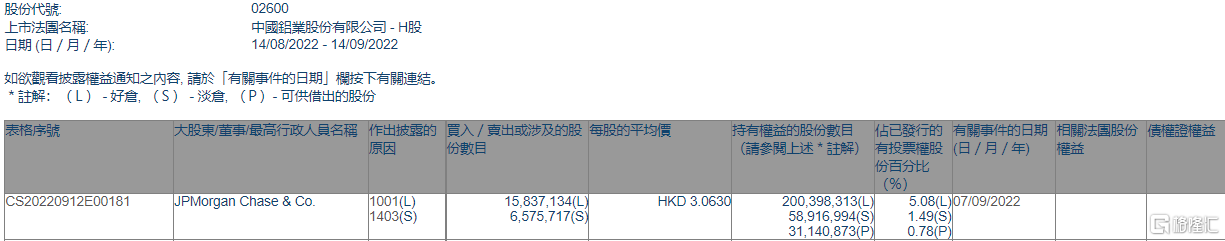 格隆汇9月14日丨根据联交所最新权益披露资料显示,2022年9月7日,中国铝业(02600.HK)获JPMorgan Chase & Co.以每股均价3.063港元增持好仓1583.71万股,涉资约4850.91万港元。