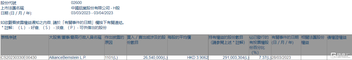 4月3日根据联交所最新权益披露资料显示,2023年3月28日,中国铝业(02600.HK)获AllianceBernstein L.P.在场内以每股均价3.9062港元增持2654万股,涉资约1.04亿港元。
