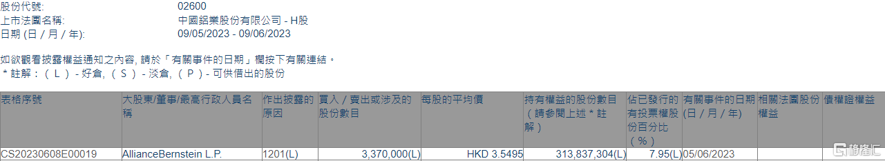 格隆汇6月9日丨根据联交所最新权益披露资料显示,2023年6月5日,中国铝业(02600.HK)遭AllianceBernstein L.P.在场内以每股均价3.5495港元减持337万股,涉资约1196.18万港元。