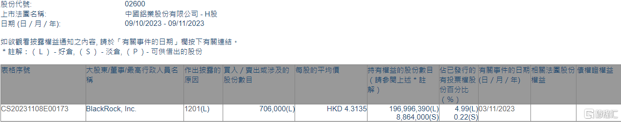 根据联交所最新权益披露资料显示,2023年11月3日,中国铝业(02600.HK)遭BlackRock, Inc.在场内以每股均价4.3135港元减持好仓70.6万股,涉资约304.53万港元。