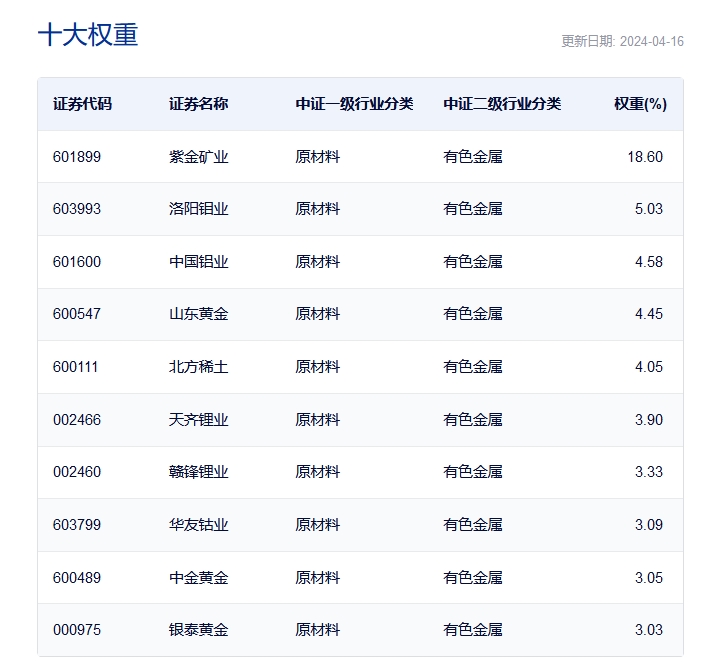 看好未来贵金属及大宗工业金属周期回归,同指数下规模最大的有色50ETF(159652)备受关注。数据显示,截至2024年4月16日,中证细分有色金属产业主题指数(000811)前十大权重股分别为紫金矿业(601899)、洛阳钼业(603993)、中国铝业(601600)、天齐锂业(002466)、北方稀土(600111)、山东黄金(600547)、赣锋锂业(002460)、华友钴业(603799)、中金黄金(600489)、西部矿业(601168),前十大权重股合计占比超52%。