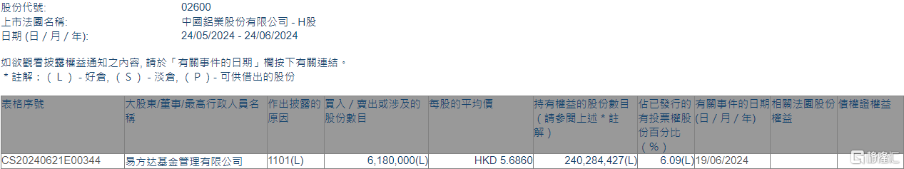 格隆汇6月24日丨根据联交所最新权益披露资料显示,2024年6月19日,中国铝业(02600.HK)获易方达基金管理有限公司在场内以每股均价5.686港元增持618万股,涉资约3513.95万港元。