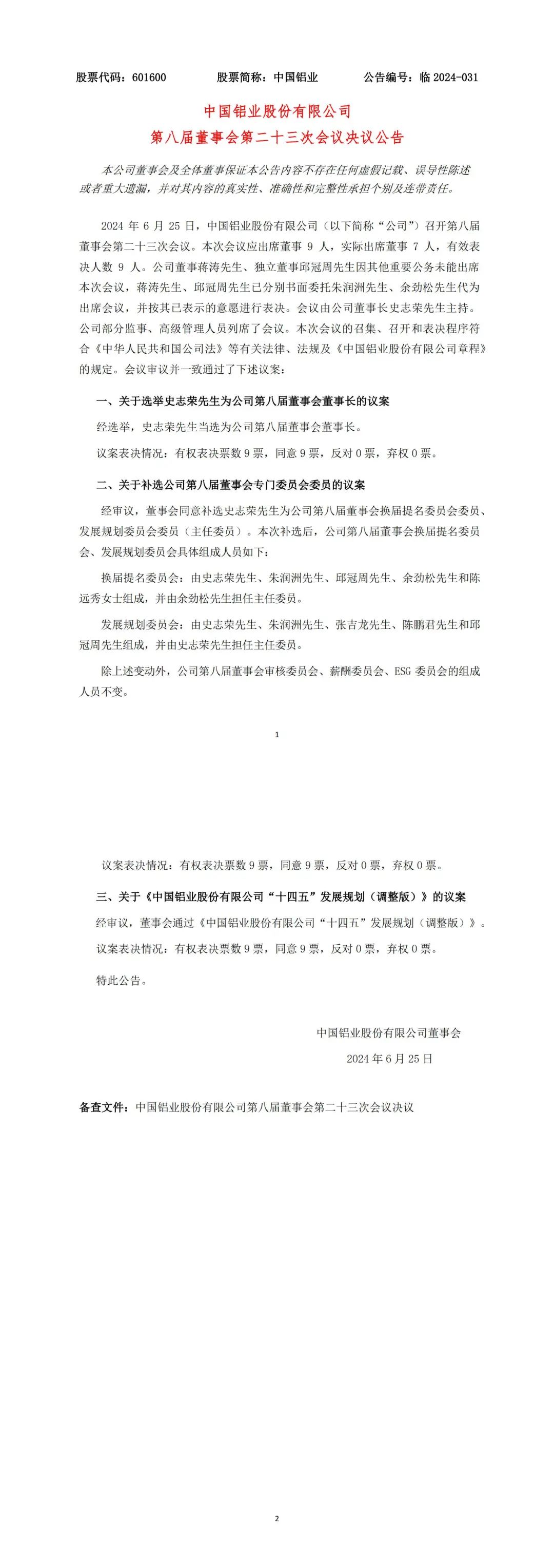 中国铝业发布公告,6月25日,公司召开第八届董事会第二十三次会议。经选举,史志荣当选为公司第八届董事会董事长。