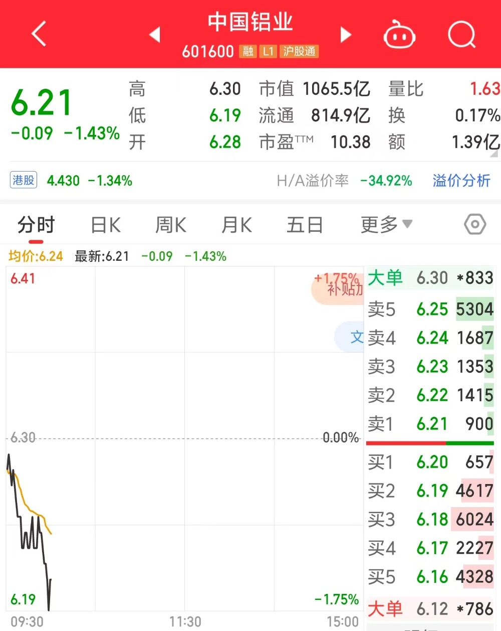 9月11日,截至上午10时,中国铝业(601600.SH)股价跌1.43%,报6.21元/股。