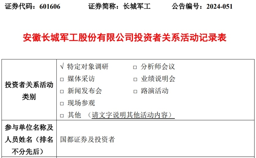 12月12日,上市公司长城军工(601606.SH)发布了《投资者关系活动记录表》,披露公司接待了国都证券及投资者的实地调研,公司总经理兼董事会秘书张兆忠、财务总监蔡芸参与并解答投资者提问。