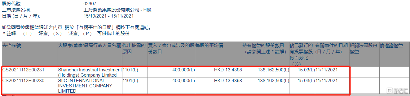 格隆汇APP获悉,根据联交所最新权益披露资料显示,2021年11月11日,上海医药(02607.HK)获Shanghai Industrial Investment (Holdings) Company Limited在场内以每股均价13.4398港元增持40万股,涉资约537.6万港元。
