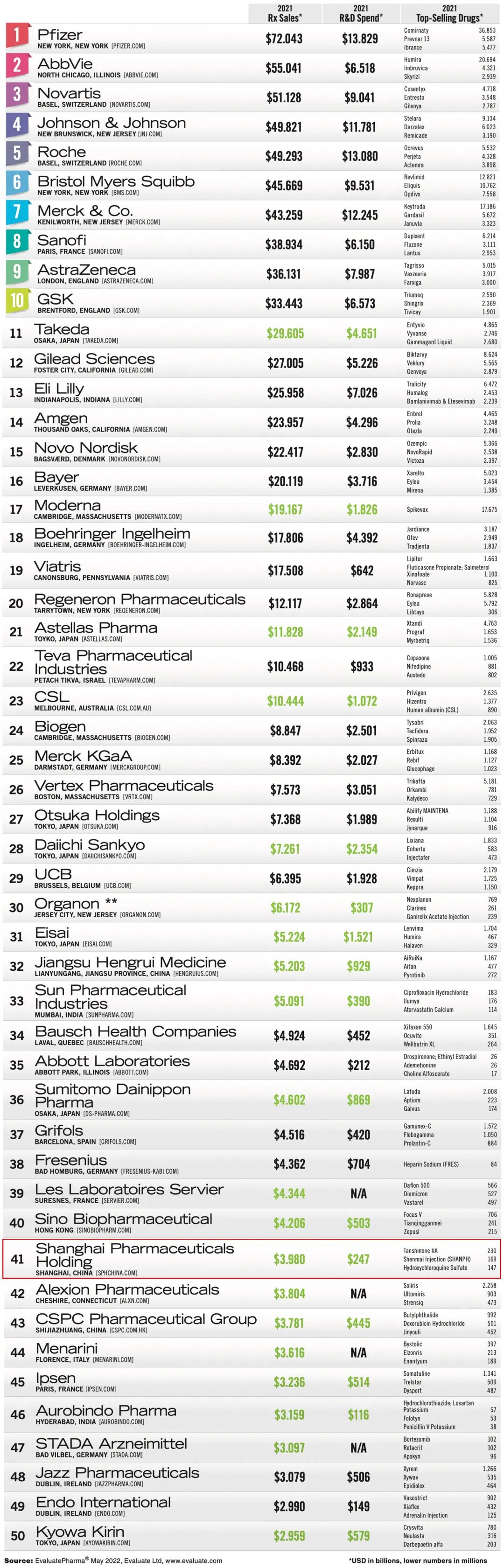 6月10日,PharmExec(美国制药经理人杂志)公布了2022年全球制药企业TOP50榜单,上海医药再度荣登榜单,排名稳步提升至第41位。