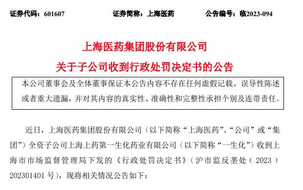 12月17日晚间,上海医药发布公告称,近日,全资子公司上海上药第一生化药业有限公司(以下简称“第一生化”)收到上海市市场监督管理局下发的《行政处罚决定书》。上海市市场监督管理局认为,第一生化实施以不公平的高价销售注射用硫酸多黏菌素B的行为违反了《反垄断法》相关规定,构成滥用市场支配地位不公平高价行为,决定没收违法所得3.3787787617亿元,并处2022年销售额3%的罚款,计1.2419855594亿元,累计被罚没超4.6亿元。