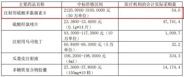 上海医药2021年年报显示,该年度,注射用硫酸多黏菌素B共计销售61万支,销售量较上期增加60.53%,其中,医疗机构2021年合计采购注射用硫酸多黏菌素B 54万支,中标价格区间为2120元-3100元,若以最低价2120元一支算,注射用硫酸多黏菌素B仅是在医院销售终端就卖了约11.45亿。