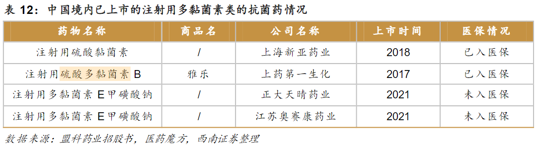 研报还显示,目前国内多黏菌素类抗生素产品获批数量较少,上市时间不长,仍处于快速增长期。目前多黏菌素类药物在多重耐药革兰阴性菌治疗中地位日益提升,相关产品销售额快速增长。