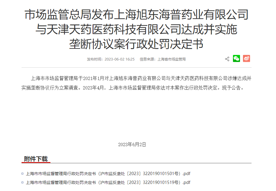 据相关行政处罚决定书,根据国家市场监督管理总局(以下简称市场监管总局)交办线索,上海市监局核查发现旭东海普和天药科技达成并实施了固定或者变更商品价格、分割销售市场的协议,排除、限制了市场竞争,损害了消费者利益和社会公共利益。