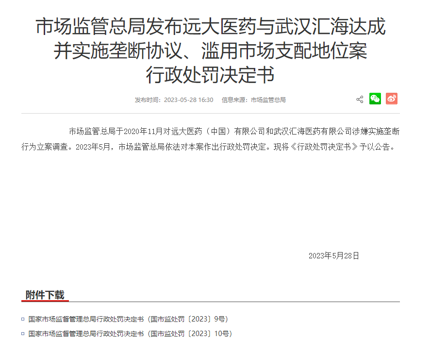 市场监管总局责令远大医药和武汉汇海停止违法行为,没收远大医药违法所得1.49亿元,并处罚款1.36亿元;没收武汉汇海违法所得3092.48万元,并处罚款412.68万元。
