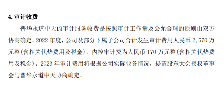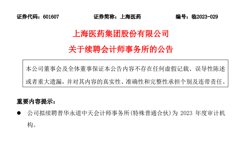 2023年3月31日,上海医药宣布续聘普华永道中天会计师事务所(特殊普通合伙)为2023年度审计机构。公告称2023年审计费用将根据公司实际业务情况,提请股东大会授权董事会与普华永道中天协商确定。