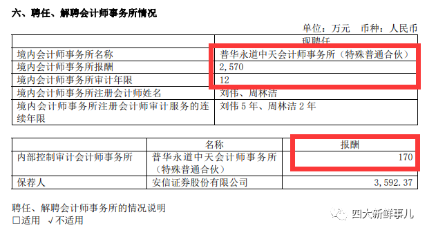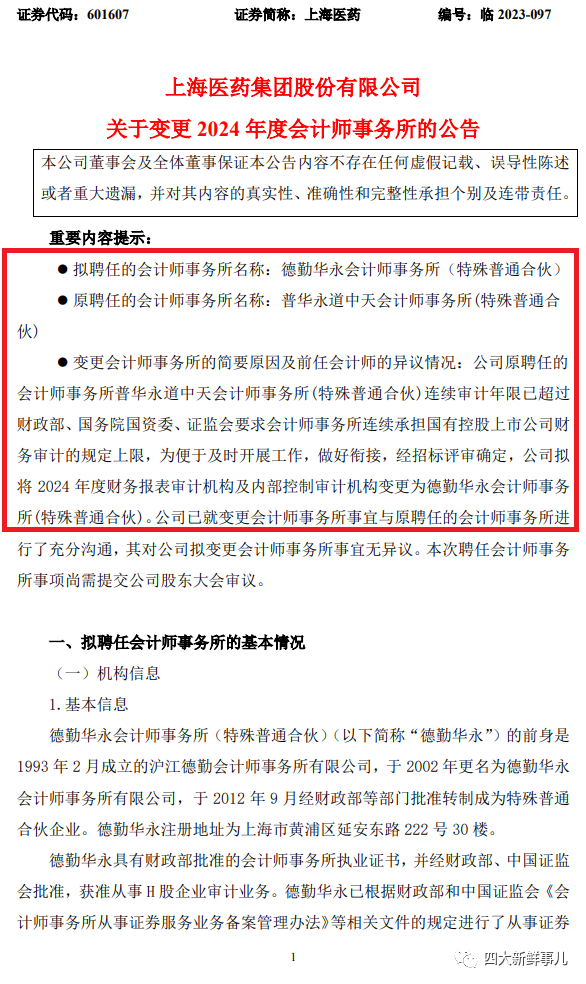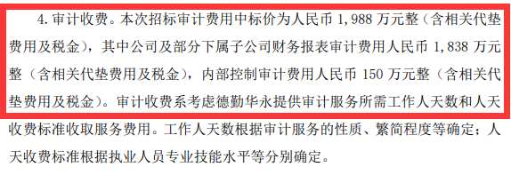 上交所主板上市公司上海医药(601607.SH)于2023年12月22日发布的《关于变更2024年度会计师事务所的公告》显示,公司原聘任的会计师事务所普华永道中天会计师事务所(特殊普通合伙)连续审计年限已超过财政部、国务院国资委、证监会要求会计师事务所连续承担国有控股上市公司财务审计的规定上限,为便于及时开展工作,做好衔接,经招标评审确定,公司拟将2024年度财务报表审计机构及内部控制审计机构变更为德勤华永会计师事务所(特殊普通合伙)。本次招标审计费用中标价为人民币1,988万元整(含相关代垫费用及税金),其中公司及部分下属子公司财务报表审计费用人民币1,838万元整(含相关代垫费用及税金),内部控制审计费用人民币150万元整(含相关代垫费用及税金)。