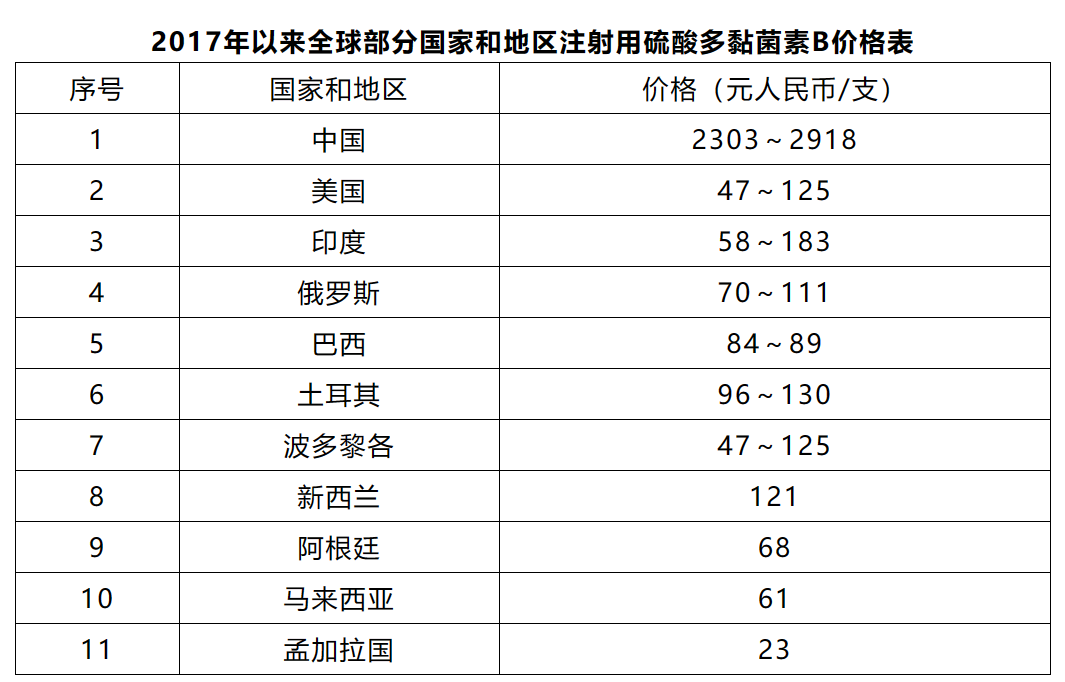 与国外同类产品相比,中国注射用硫酸多黏菌素B的销售价格显著畸高:根据第三方统计数据,2022年注射用硫酸多黏菌素B在其他国家和地区的加权平均价格为65元/支,中国市场挂网价格是该价格的35~44倍。