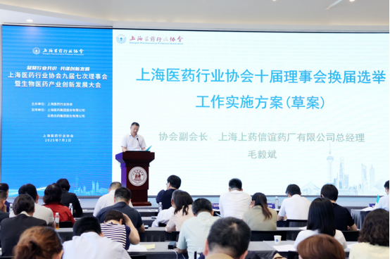 ▲协会副会长、上海上药信谊药厂有限公司总经理毛毅斌作关于“协会十届理事会换届选举工作实施方案(草案)”的说明