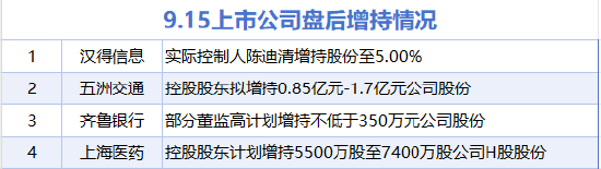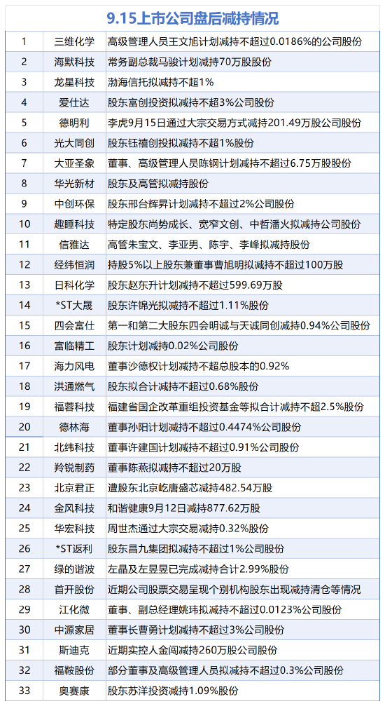 据统计,9月15日,盘后汉得信息、五洲交通、齐鲁银行、上海医药披露增持情况。包括三维化学、海默科技、富临精工、海力风电、爱仕达(维权)、、洪通燃气、福蓉科技(维权)、德林海、北纬科技、龙星科技、羚锐制药、北京君正、金风科技、德明利、光大同创、大亚圣象、信雅达、中创环保、趣睡科技、华光新材、经纬恒润、日科化学、ST大晟、四会富仕、ST返利、绿的谐波、首开股份(维权)、江化微、华宏科技、中源家居、斯迪克、福鞍股份、奥赛康在内的33家A股上市公司披露减持情况。