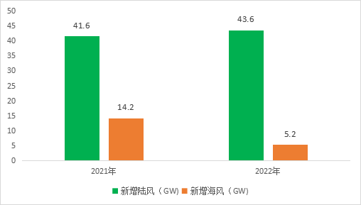 BNEF数据显示:2022年中国风电新增吊装容量为48.8GW,相较于2021年下降13%。其中,陆上风电新增43.6GW,同比小幅增长5%;海上风电新增5.2GW,同比下降64%。