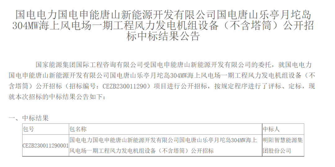 近日,国电电力国电申能唐山新能源开发有限公司国电唐山乐亭月坨岛304MW海上风电场一期工程风力发电机组设备(不含塔筒)公开招标中标结果公布,明阳智能成功中标,投标报价为85028.80002万元,折合单价约2797元/kW(不含塔筒)。